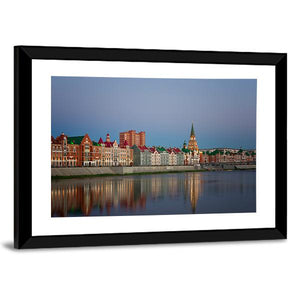 A photographic cityscape of Yoshkar Ola at sunset, featuring colorful riverfront buildings, a tall church spire and calm water reflections. The realistic image evokes a peaceful, tranquil mood and fits well with modern living room décor.