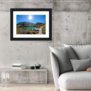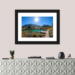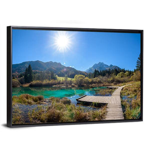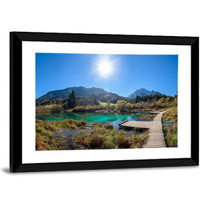 Zelenci Lake in Slovenia appears in a wide, panoramic nature photograph featuring clear turquoise water, a wooden boardwalk, trees and a distant mountain range. The scene feels serene and majestic with sunlight reflecting on the lake and dense green foliage—an understated focal piece for living rooms and nature-inspired spaces.
