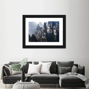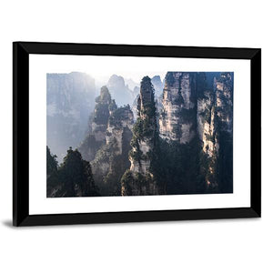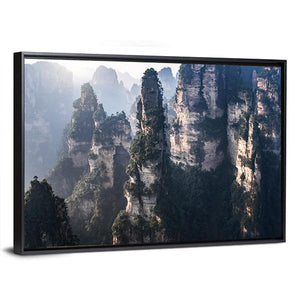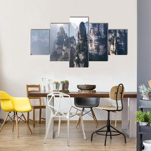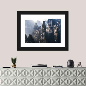 This canvas art captures the serene beauty of Zhangjiajie National Forest Park in China, featuring majestic rock formations and lush trees shrouded in mist. The atmospheric landscape invites a sense of tranquility, making it a perfect addition to any nature-themed decor.