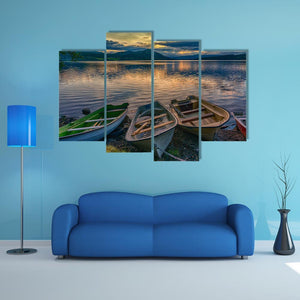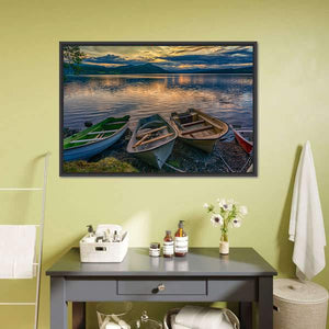 Three rowboats rest at the shore of a tranquil lake beneath distant mountains and a soft sunset sky. Rendered in a realistic landscape with blues, oranges, greens and browns, the composition feels serene and peaceful and works well in modern or nature-inspired rooms.