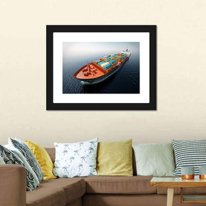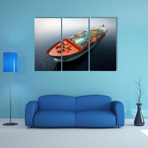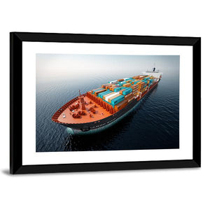 Container Ship In Ocean Canvas Art shows an overhead view of a large container ship carrying many stacked containers, with a red hull and white bow cutting through the open sea. Its orange, blue, white, and grey palette creates a calm, vast, industrial mood that suits modern rooms and nautical or industrial-style spaces.