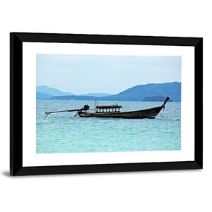 This serene canvas art features a longtail boat gently gliding across a calm sea, framed by mountains in the distance. The calming blues and greens evoke a peaceful atmosphere, making it an ideal addition to your living space or nautical-themed room.