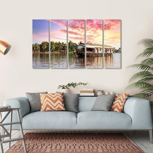 This beautiful canvas art features a traditional houseboat nestled along a tranquil river in Kerala, surrounded by lush tropical trees beneath a colorful sunset sky. The scene radiates serenity and offers a picturesque view that brings warmth to any space.