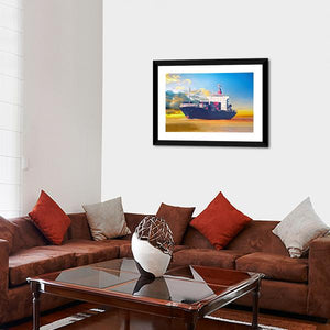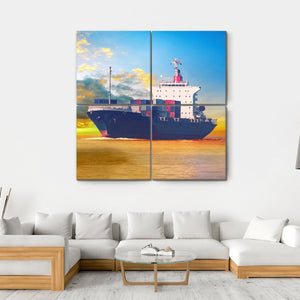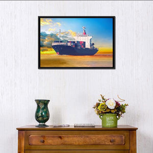 This captivating canvas features a majestic container ship navigating a vast ocean at sunset. With a serene palette of blues and warm oranges, it brings a touch of modern elegance to your space.