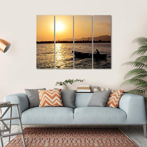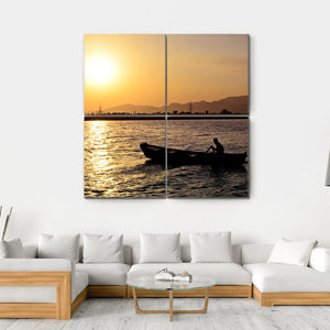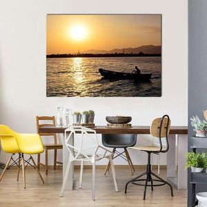 This canvas art captures a tranquil sunset over water, featuring a solitary boat with a person sailing towards distant mountains. The warm palette of orange, yellow, and blue creates a peaceful atmosphere, perfect for enhancing your space.