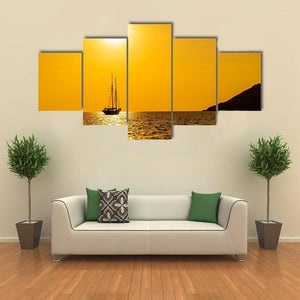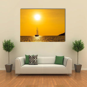 A silhouetted sailboat crosses a calm sea at sunset, rendered in warm golds and oranges against deep blue and brown. The realistic, rule-of-thirds composition creates a serene, peaceful mood and suits modern room decor.