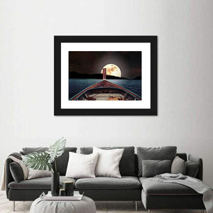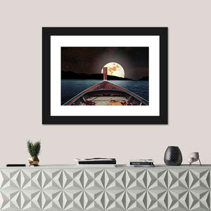 This canvas art features a serene wooden boat gliding through calm waters under a mystical night sky. A full moon and starry backdrop create a tranquil atmosphere, making it an inviting addition to any space.