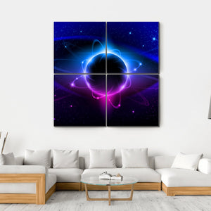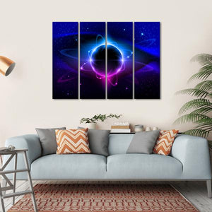 Explore the depths of a cosmic blue nebula with this stunning canvas wall art. It features glowing neon orbits surrounding a dark planet, set against a mesmerizing starfield background. This abstract piece evokes an energetic and futuristic mood, making it a perfect addition to a space-themed room or modern décor.