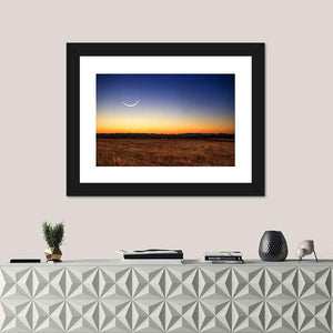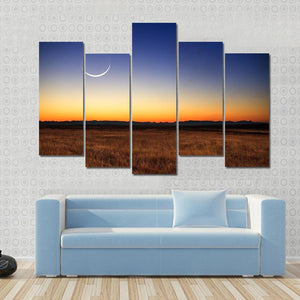 This landscape artwork captures a serene twilight scene with a illuminated crescent moon over vast grassland at sunset. The rich palette of blues, oranges, and browns adds a peaceful touch to your space.