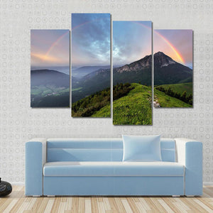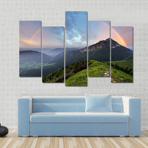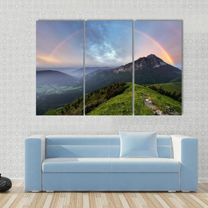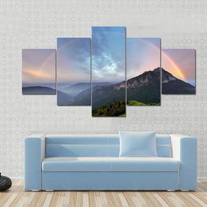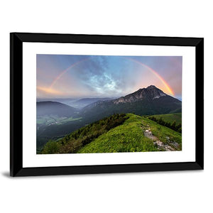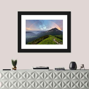 This landscape canvas features a majestic mountain peak beneath a soft rainbow, creating a serene and awe-inspiring atmosphere. A winding path leads the eye through verdant valleys, making it a striking addition to any space.