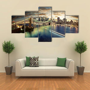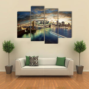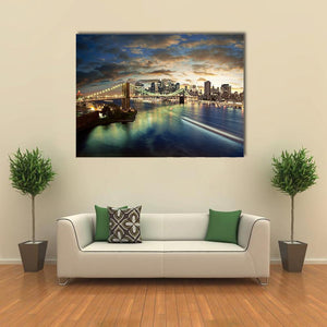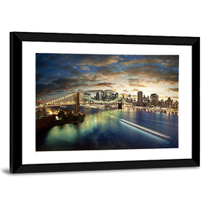 Clouds Over Brooklyn Bridge captures a twilight city skyline with the bridge arcing over the river, sweeping clouds and blue‑gold tones. The modern, panoramic composition and subtle light trails from a passing boat create an energetic, vibrant mood that fits modern homes and room decor.
