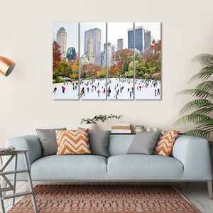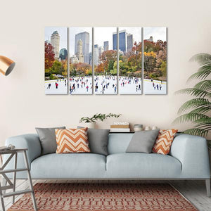 Capture the lively spirit of New York with this canvas wall art featuring ice skaters enjoying a bustling rink surrounded by autumn foliage. The vibrant blues, greens, and oranges create a seasonal atmosphere, making it a perfect addition to any urban décor.