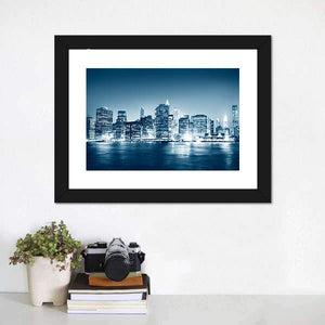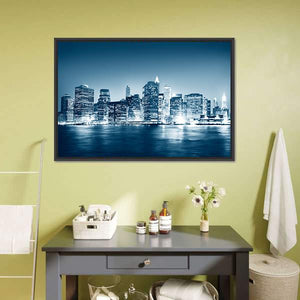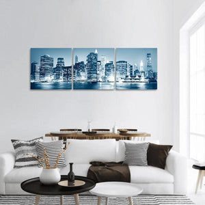 A panoramic canvas featuring the New York City skyline and Manhattan at night, with illuminated skyscrapers reflected on the water. Rendered in blue, white and black, it offers a dramatic yet serene cinematic city mood and suits modern interiors.