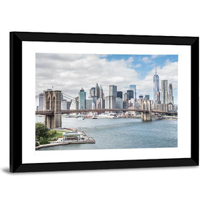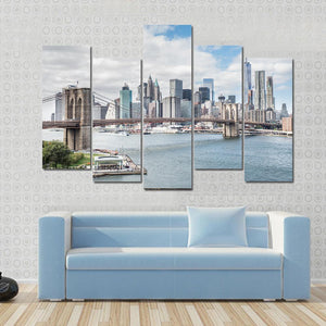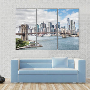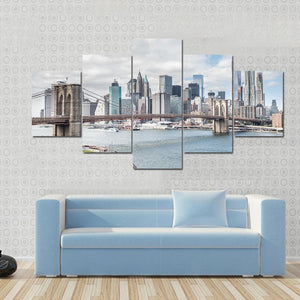 This canvas wall art features a panoramic view of the Brooklyn Bridge against the stunning Manhattan skyline. The calm blues and grays create an expansive urban atmosphere, perfect for modern decor.