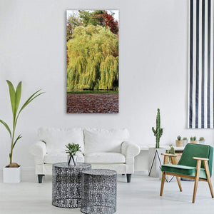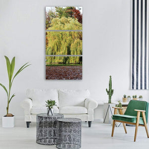 A centered landscape of a weeping willow beside a pond, with fallen leaves floating on the water. The scene reads naturalistic and serene, with a yellow-green, brown, and dark green palette that feels autumnal. Works well in modern or nature-inspired rooms as a calm focal point.