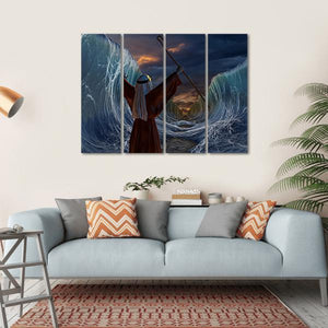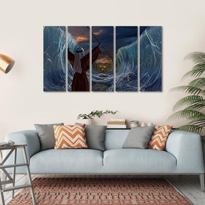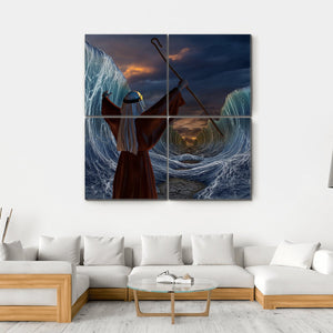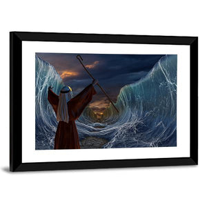This captivating canvas art depicts a dramatic scene from the biblical narrative of the parting of the Red Sea. Featuring deep blue waters and the striking figure of a person holding a staff amidst towering walls of water, it brings a powerful sense of depth and movement to any space.