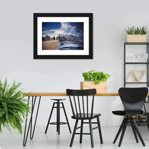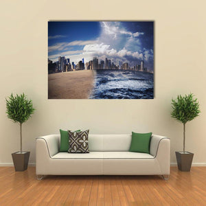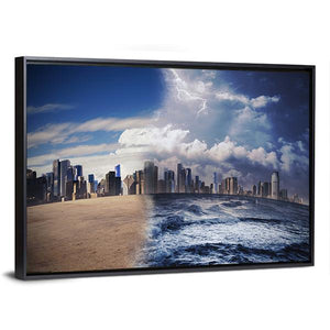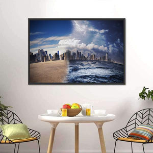 This powerful landscape art piece captures the dramatic contrast of stormy weather and rising seas. Featuring cityscapes and ocean waves, its blue and grey palette evokes a deep connection to earth and climate themes.