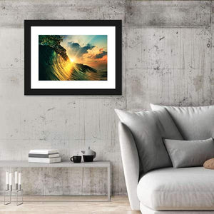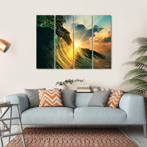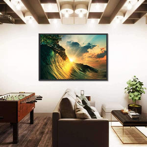 Experience the intense beauty of an ocean wave captured at sunset. This vibrant artwork showcases a dramatic perspective filled with golden and teal hues, evoking a serene and powerful atmosphere. Perfect for enhancing any space with a touch of nature's awe-inspiring moments.