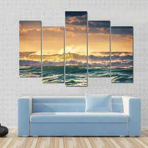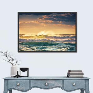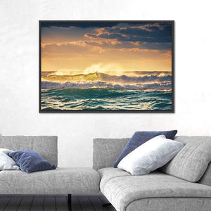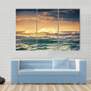 This canvas art captures the serene beauty of ocean waves at sunrise. The golden hues and dramatic clouds create a peaceful yet energetic atmosphere, making it a lovely focal point for any modern space.