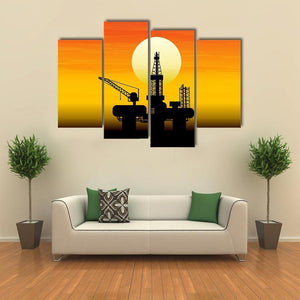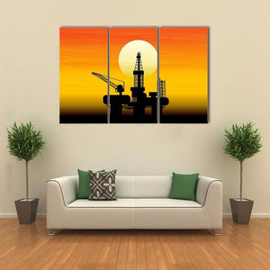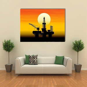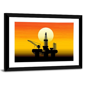 A centered silhouette of an oil rig rises from the sea beneath a stylized sun. Rendered in a limited orange, yellow and black palette, the piece carries an industrial, dramatic mood with minimalist, modern lines. Suits modern living rooms, offices, or hallways that favor bold, graphic landscape art.