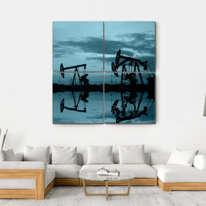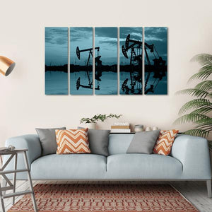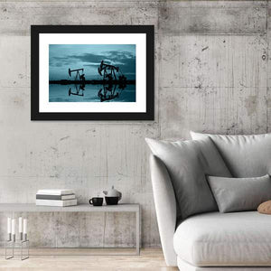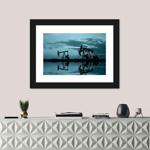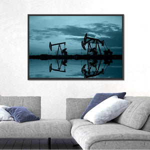 This canvas art captures the beauty of oil pumps silhouetted against a dramatic sky. The calm water reflects the industrial landscape, creating an atmospheric scene that blends shades of blue, gray, and black. It's an ideal choice for modern decor, infusing a sense of depth and intrigue into any space.