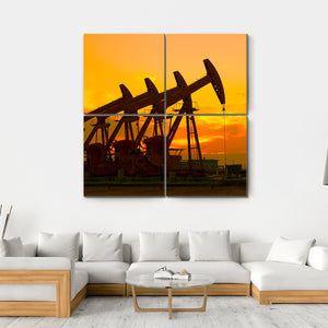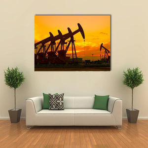 This canvas art features oil pump jacks silhouetted against a striking orange sunset. The warm hues of red and yellow combine with a textured sky, creating a dramatic industrial landscape that adds character to any space.
