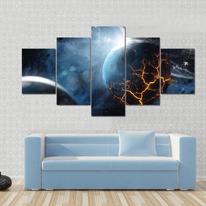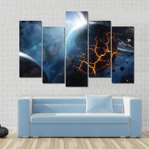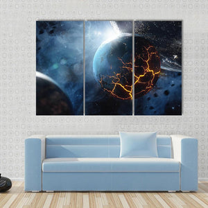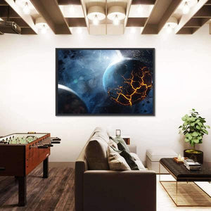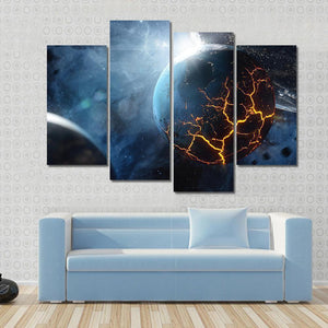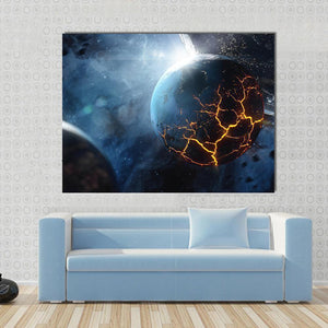 This canvas art features a captivating planet bathed in orange magma, set against a backdrop of distant stars and nebulae. Its cosmic and dramatic vibe makes it an awe-inspiring focal point for any modern space.