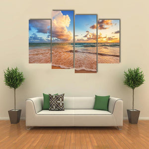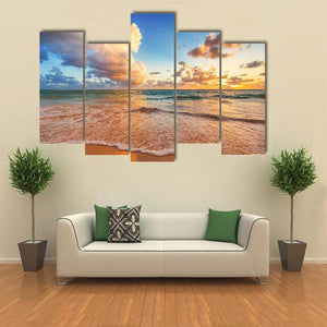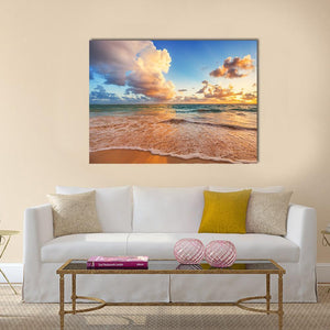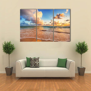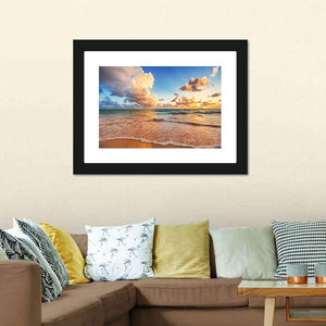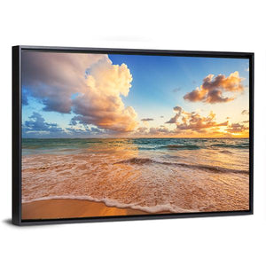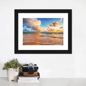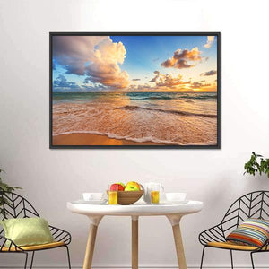 This artwork captures a serene ocean sunset, showcasing dramatic clouds and vibrant sun rays over gentle waves. With its modern style and tranquil palette of orange, blue, and white, it’s a beautiful addition to any nature-inspired décor.