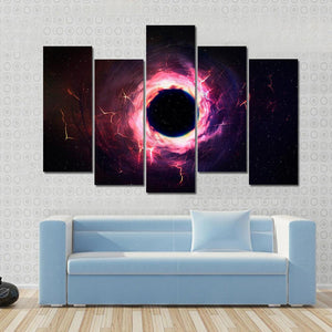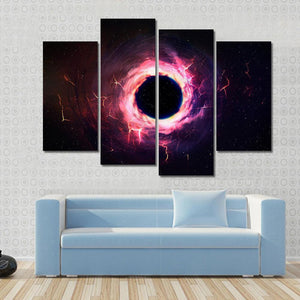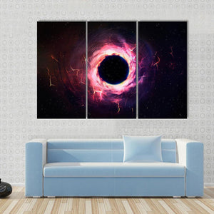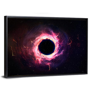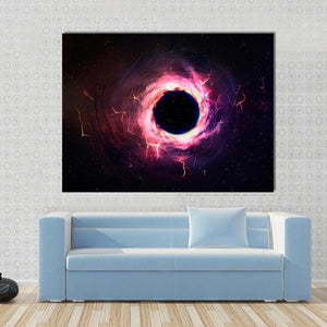 This canvas art captures the mystery of a black hole, featuring a swirling accretion disk and tendrils of light against a cosmic backdrop. Its striking colors of black, pink, purple, and orange create an awe-inspiring atmosphere perfect for adding intrigue to your wall decor.