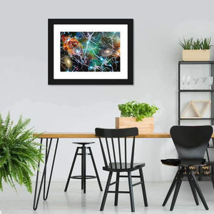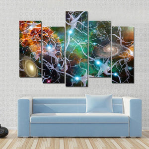 The Brain Cells Canvas Wall Art features an abstract representation of neurons and cosmic elements like galaxies and stars. Its vibrant palette of blue, green, orange, and purple creates an ethereal and complex atmosphere, making it a captivating piece for modern decor.