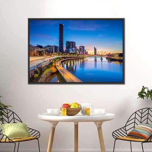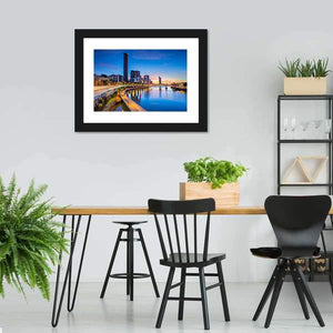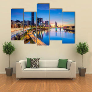 Brisbane Skyline At Sunrise presents a wide-angle cityscape with tall skyscrapers, an illuminated bridge, and reflective river water washed in blue and orange sunrise tones. The modern composition feels both serene and vibrant, suited to contemporary home decor that favors city and landscape art.