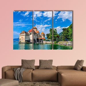 Castle Chillon captures a lakeside castle with red-tiled roofs, trees, and a blue sky scattered with clouds. The rule-of-thirds composition and a blue-green-brown-white palette give the scene a serene, picturesque mood. It suits modern or nature-inspired rooms looking for calm, scenic wall decor.