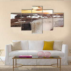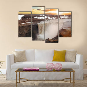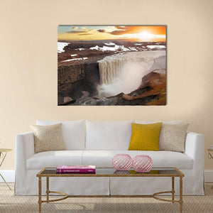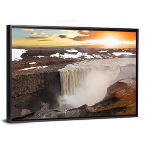 This striking canvas art features the majestic Dettifoss Waterfall in Iceland, showcasing dramatic views of the canyon during sunset. The realistic depiction captures the powerful motion of water amidst striated rock formations and rising mist, making it a stunning addition to any landscape decor.