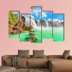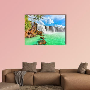 Nur Waterfall in Vietnam shows a wide, eye-level view of a cascading waterfall with turquoise water, rocky outcrops and lush green foliage beneath fluffy white clouds. The photographic, realistic scene feels vibrant and serene and brings a natural, peaceful atmosphere to a room. It works well in modern, nature-inspired rooms as a nature-focused wall piece.