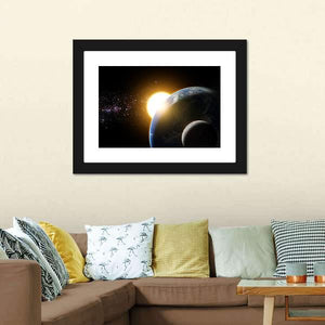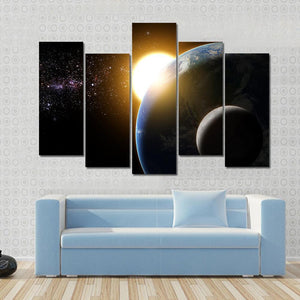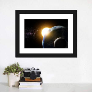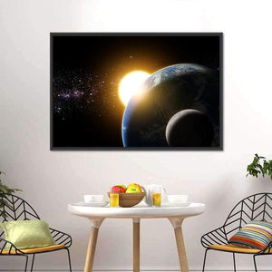 This canvas art captures the Earth and moon in a cosmic scene, featuring a glowing sun and a detailed starfield. Its modern design adds a vast and awe-inspiring atmosphere to any space.
