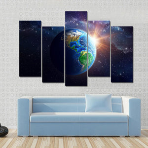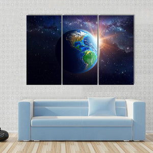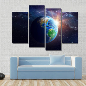 This canvas art features a stunning view of Earth from space, beautifully showcasing continents and a captivating cosmic background of stars and nebulae. Its awe-inspiring colors create a vast atmosphere, perfect for adding a touch of modern decor to any room.