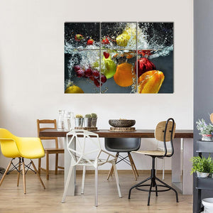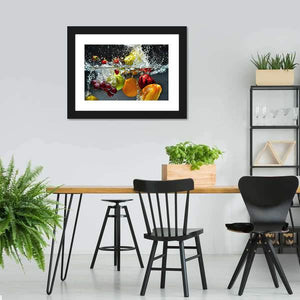 This vibrant canvas art captures a dynamic splash of fruits submerged in water, showcasing strawberries, grapes, pears, oranges, and starfruit. Its refreshing and energetic vibe makes it an exciting piece for modern decor.
