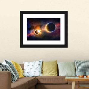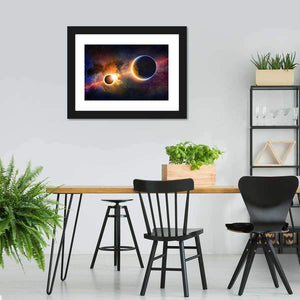 This captivating canvas artwork depicts a glowing planet Earth set against the vast cosmos, featuring a stunning corona around the solar eclipse. With its vivid palette of black, orange, blue, purple, and yellow, it brings a cosmic, awe-inspiring vibe to any space.