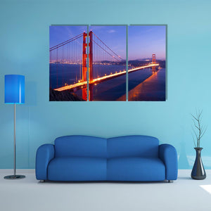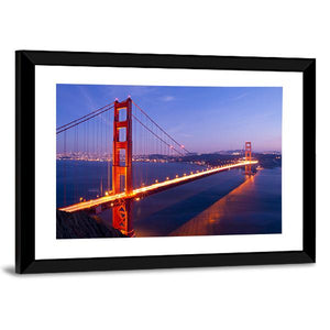 This canvas artwork beautifully captures the Golden Gate Bridge, illuminated against a serene backdrop of city lights and water. The modern landscape design evokes an urban feel, perfect for both contemporary and classic spaces.