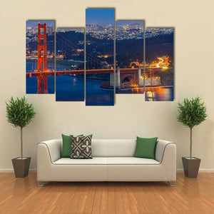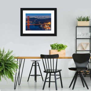 This photorealistic canvas captures the Golden Gate Bridge and San Francisco skyline at night. Warm orange bridge lights against deep blue bay water create a majestic, vibrant, and serene mood that suits modern living rooms or office walls.