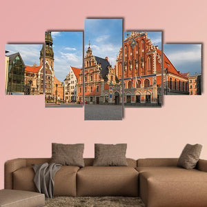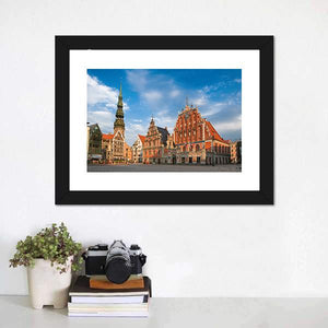 House Of The Blackheads depicts historic buildings and a tall steeple set beneath a blue sky with clouds. The eye-level composition fills the frame with ornate facades and a steeple with a clock, giving the print a sunny, architectural, historic mood. Suits modern interiors or rooms that favor cityscape and architectural prints.