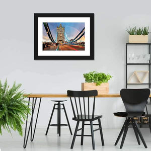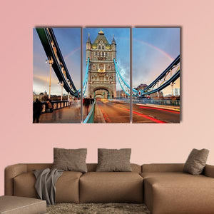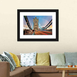 This London Tower Bridge canvas captures the bridge and a rainbow in a wide-angle, low-perspective cityscape. Rich blues, grey, orange and purple combine with vehicle light trails and motion-blurred pedestrians to create a vibrant, dynamic, magical scene. A natural fit for modern living rooms or offices as a colorful city focal point.