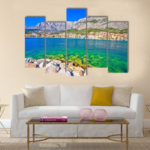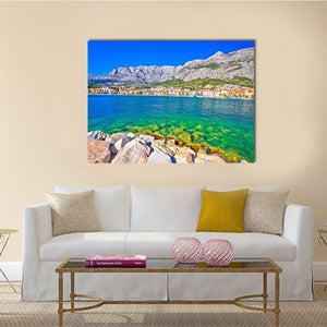 Makarska Turquoise Waterfront Canvas shows a coastal town beside clear turquoise water and a rocky shoreline, with snow-capped mountains on the horizon. Rendered in a realistic, vibrant palette of blue, green, white, red, and yellow, it creates a scenic, serene daytime mood that fits modern living rooms and coastal-style homes.