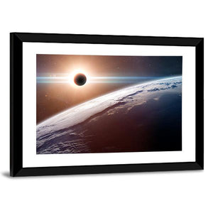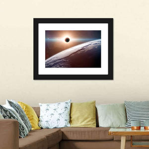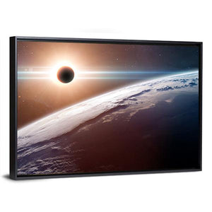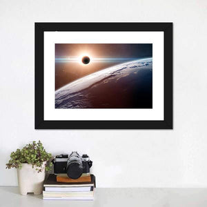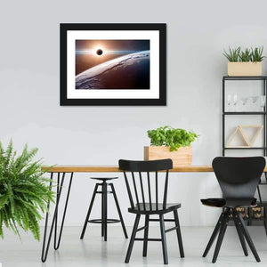 This canvas art captures the awe-inspiring moment of a solar eclipse as seen from space, showcasing Earth framed by the glowing corona of the sun. With its serene cosmic mood and modern celestial style, it fits beautifully in any contemporary living space.