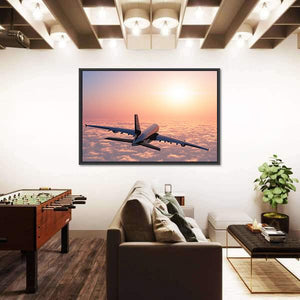 This stunning artwork features an airplane soaring gracefully above the clouds against a majestic sunset. The serene palette of orange, pink, blue, and white creates an atmospheric vibe that will enhance any space.