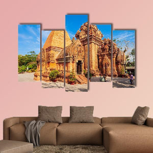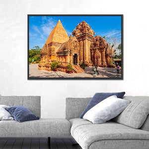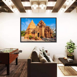 Ponagar Temple in Vietnam is shown in photorealistic detail, highlighting its pyramidal stone towers and ornate carvings. Warm orange-brown tones, bright blue sky and surrounding foliage give the image a historic, peaceful mood while people in the scene provide scale. Suited to modern living rooms or a study as architectural wall decor.