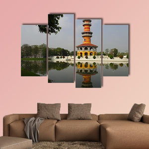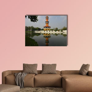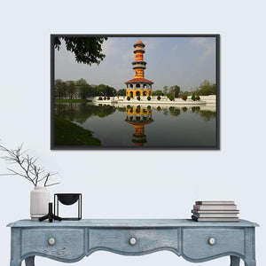 Royal Summer Palace, Bang Pa In, Thailand is shown here in a calm, symmetrical scene. An ornate multi‑tiered tower rises above still water, its yellow, orange, blue and green tones reflected beside trees and white circular decorative details. The artwork has a serene, picturesque mood and suits modern room decor.