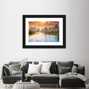 Scenic Guilin Scenery shows a peaceful Guilin river landscape with karst mountains, calm water and small boats beneath a sunset sky. The realistic wide-shot composition uses blues, greens and warm oranges to create a serene, peaceful mood. It suits modern or nature-inspired rooms as a calming focal point.