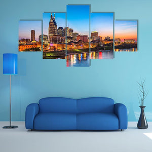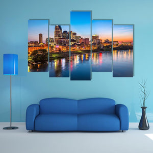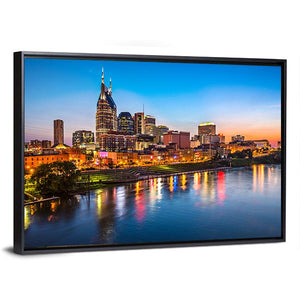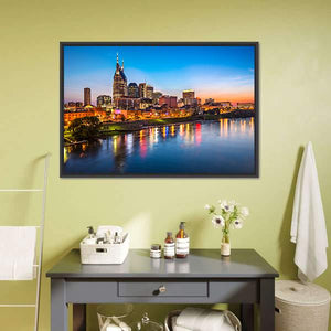 Capture the vibrant spirit of Nashville with this beautiful canvas wall art featuring the city skyline. The lively colors of the twilight sky reflect in the water, showcasing tall modern buildings against a stunning waterfront scene.