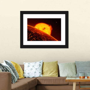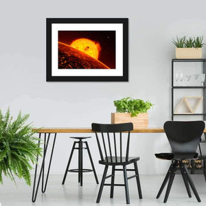 Experience the fiery beauty of our Sun View from Mercury wall art. This piece captures a dynamic angle of the sun, showcasing dramatic solar flares against a vibrant palette of orange, yellow, and black. It's perfect for adding a powerful touch to any room.